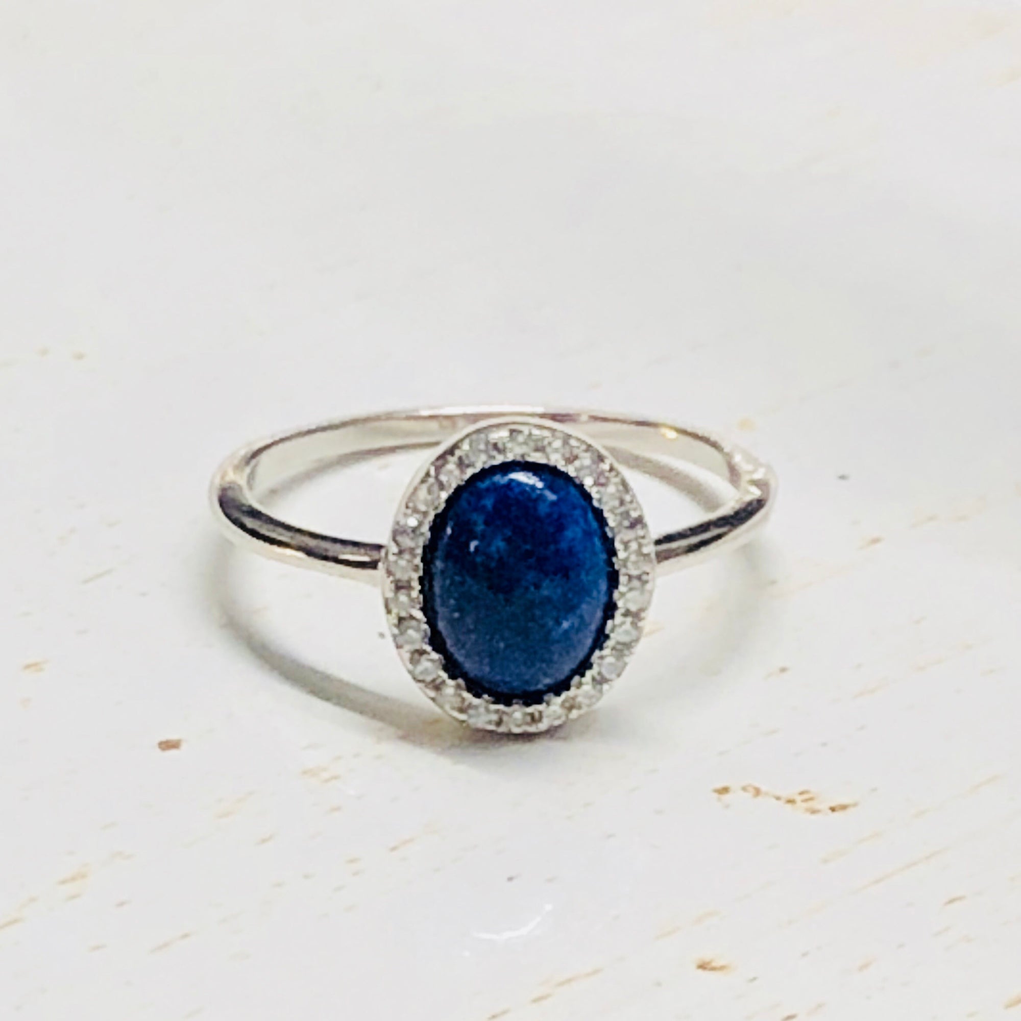 Sterling Silver Oval Lapis and CZ Halo Ring, Size 7.