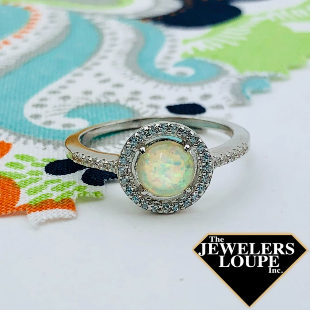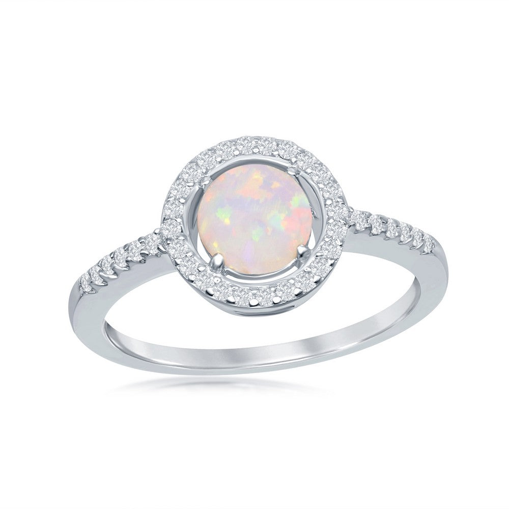 Sterling Silver Round Created White Opal with CZ Halo Ring, Size 8.