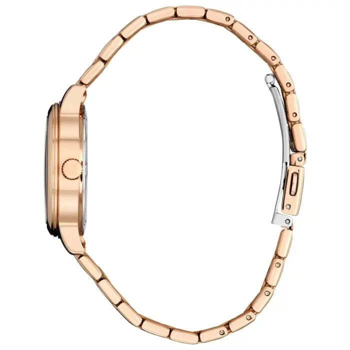 The Citizen Ladies Eco-Drive 34mm Watch (EW2623-53X) exudes timeless elegance with a warm, contemporary twist. Its rose gold-tone stainless steel case and bracelet create a refined, luxurious look, beautifully complemented by a deep green dial featuring classic Roman numeral hour markers. The slim hands and subtle date display at 3 o’clock add both sophistication and practicality. Powered by Citizen’s Eco-Drive technology, it runs on any light source—eliminating the need for batteries while offering reliable, sustainable performance. Perfect for both everyday wear and special occasions, this watch combines graceful style with modern functionality.